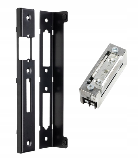 Kaseta elektrozaczepu w komplecie z blachą oporową do zamontowania na słupku.